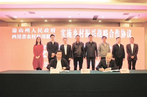 本报讯 3月15日,凉山州人民政府与四川省农村信用社联合社在西昌市签署《共同推进实施乡村振兴战略合作协议》。双方约定,到2021年,四川农信对凉山州授信1000亿元支持乡村振兴,并助力实现乡村支付结算渠道全覆盖、形成立体的现代农村金融服务体系,为凉山州提升农业现代化水平、促进城乡融合发展、实现全面乡村振兴提供强有力的金融支持。这也是首次由省级法人银行机构与市州政府签署战略合作协议、助力乡村振兴。四川省委常委曲木史哈出席签约仪式并见证签约。