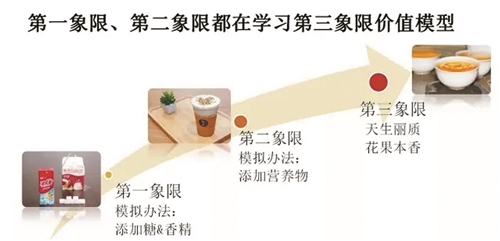 茶饮的整个价值模型特征是:第一象限拼命模拟第三象限的茶——天生丽质、花果本香,但它用了添加糖和香精的方式解决,不像第二象限茶饮,可以添加牛奶、鲜果等,用天然的方式去模拟。