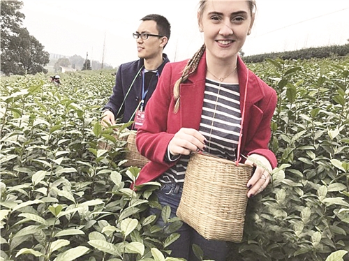 在重庆巴南区二圣镇巴山村里,21岁的乌克兰姑娘奥莉娅背着采茶小篓子,半弯着身子,专注地观察茶叶。“茶香全胜酒,红颜入醉乡”,春风微醺,茶香扑鼻。