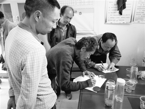 4月10日,贵州省铜仁市供销合作社帮扶小组带领印江土家族苗族自治县缠溪镇青杠林村帮扶点相关人员为6户贫困户送去了12头“小耕牛”,这是铜仁市社根据当地实际情况推出的扶贫新举措。据悉,一年后,铜仁市社会以高于同期市场价收购12头牛。在收回成本后,所有利润归贫困户。同时,市社还建立了贫困户养殖奖励机制,即一年后市社将对6户养殖户开展有奖评比活动,前三名给予500元、400元、300元的奖励。图为贫困户与青杠林村“两委”签订养牛协议。