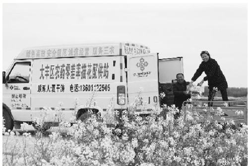4月上旬,江苏省盐城市大丰区供销合作社组织2000多个品种30多吨“零差率”农药,送到全区300多个家庭农场主和12000多个种田大户田头,农民们喜上眉梢。图为4月13日上午,供销合作社送货员在大丰区万盈镇李北村家庭农场主李志平的田头卸货。蔡根青 摄
