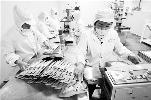 4月11日,连云港市一家紫菜厂的员工在忙着深加工出口紫菜食品。今年以来,江苏省连云港海域紫菜养殖面积已经突破了40万亩,紫菜的产业发展步伐越迈越大,已经成为当地海洋经济的支柱产业。目前正值紫菜生产和销售旺季,全市165家紫菜加工企业满负荷运转对紫菜进行加工生产。连云港是全国沿海最大的紫菜育苗、养殖、加工、出口基地,生产的紫菜产品畅销欧洲、美洲、日、韩及东南亚等40多个国家地区。