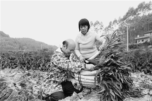 时下,正是新鲜蔬菜大量上市的季节。在广西壮族自治区河池市环江毛南族自治县思恩镇城南社区石门沟屯“菜篮子”工程蔬菜基地,绿色蔬菜种植合作社社员、菜农罗书保与妻子忙着收割莴笋,满脸丰收的喜悦。近年来,环江坚持以现代生态理念做好农业发展,通过“党支部+合作社+农户”的发展模式,大力实施土地流转,建立“菜篮子”工程蔬菜基地,采用无公害栽培技术,引导农户规模化、标准化种植绿色蔬菜,优质蔬菜畅销金城江、南丹、柳州等地,贫困群众走上了致富道路。