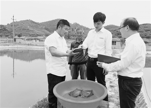 为帮助农民增收致富,江西南丰农商银行把支持龟甲产业发展作为重点工作来抓。该行不断创新信贷产品,加大信贷投放力度,以满足广大农民养殖龟甲的资金需求。截至3月末,该行已为437户村民发放了养殖龟甲贷款1.35亿元。图为该行客户经理在甲鱼养殖户汤国龙的养殖池塘了解其资金使用和甲鱼生长情况。