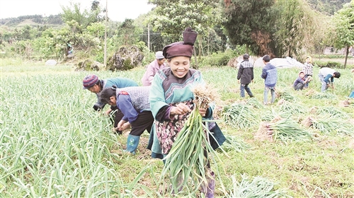 4月14日,三都县社党支部直播小分队的直播活动在中和镇拉海村正式拉开大幕。田间地头随处可见水族农民采收蒜苗的身影。活动上线短短一小时,粉丝量突破4万余人次,吸引湖南、贵阳、黔南等地的3家采购商下单,成交量达11122斤。拉海村贫困户韦小燕家今年种了2亩多大蒜,经过精心管理,蒜苗长势良好,眼看就要到了耕田插秧的时节,韦小燕和村里的大多数贫困户一样,刚开始有些心急如焚,怕大蒜卖不出去,不过随着供销合作社的闪电直播,韦小燕打开了心结:“政府免费发蒜给我们种,今天又来收了2000斤蒜苗,我真的太高兴了! ”
