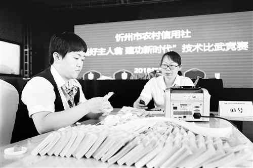 5月14日-15日,山西省忻州市农村信用合作社联合社举办了“当好主人翁 建功新时代”技术比武,来自14个县级行社的116名选手进行了单指单张点钞+机器点钞、单指多张点钞+机器点钞、翻打百张传票、珠算加减乘除、柜面业务知识测试+上机业务实操和文明规范服务实操等八个项目的竞赛。