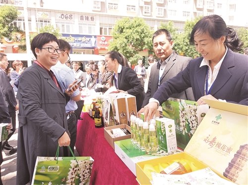 5月22日,中央企事业单位在陕定点扶贫工作座谈会在陕西省咸阳市永寿县召开,永寿县供销合作社工作人员向参会者宣传推介当地槐花蜜、核桃、挂面等品牌农产品,助力脱贫攻坚。永寿县社注册成立了槐海旅游产品开发公司,整合县域农产品资源,积极包装当地特色农副产品,采取“龙头企业+专业合作社+贫困户”运行模式,解决农产品销售,提高农产品卖点和附加值,实现农民增收致富。槐海旅游产品开发公司共策划包装了槐花蜜、苹果、核桃等九大类24个系列农产品,打造成旅游产品,深受消费者青睐。其中,永寿槐花蜜获2018咸阳首届旅游商品大赛二等奖。