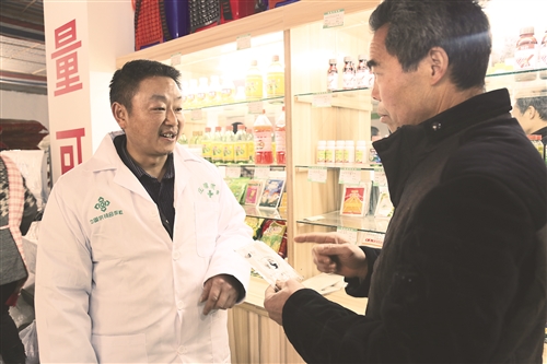 5月29日,一大早上,金山镇庄稼医生王毅和他的妻子便开始忙碌起来,帮农户称种子、拿药、配药,并给他们讲解关于这些药品的使用规范,庄稼医院内一派繁忙景象。这样的景象在金山镇庄稼医院已成常态。
