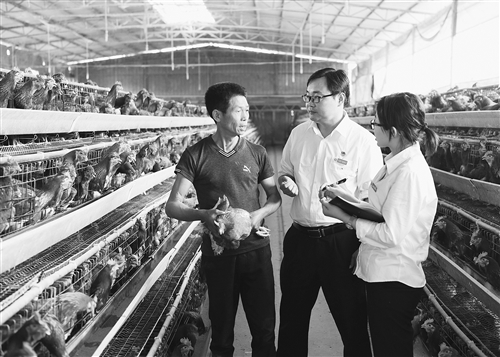 南丰平安蛋鸡养殖场在江西南丰农商银行30万元贷款的支持下,从河北购进京红1号鸡种21500羽饲养,目前该鸡场日产鸡蛋19000多个,年创产值可达2500多万元。图为该行客户经理到鸡舍了解资金使用和蛋鸡养殖情况。