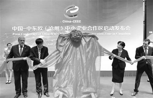 6月15日,中国—中东欧(沧州)中小企业合作区在河北省沧州市渤海新区揭牌。据了解,这一合作区以“一区三园”(科技创智区、通用航空园、高端制造园、绿色农产品产业园)为发展格局,加强与以中东欧国家为重点的欧洲各国在现代科技与服务、通用航空、高端制造、绿色农产品等领域的合作。图为出席活动的中外嘉宾合影留念。