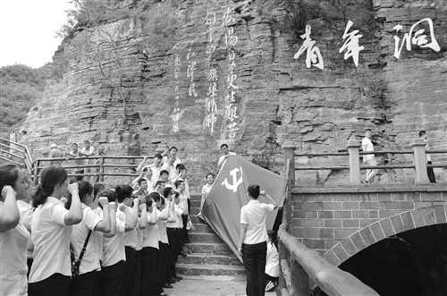 为重温党的光辉历史,进一步激发全行广大党员、干部振奋精神,干事创业的工作激情,山西平顺农商银行结合实际,在全行组织开展了“启动智慧党建、选树模范典型、走访慰问党员、开展专题党课、接受红色教育、重温入党誓词、组织集体签名”纪念建党97周年“重温红色记忆、凝聚奋进力量”系列主题活动。图为平顺农商银行全体党员在红旗渠青年洞前集体宣誓。