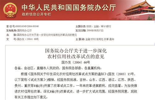 2004年8月17日,国务院办公厅发布《关于进一步深化农村信用社改革试点的意见》(国办发〔2004〕66号)。