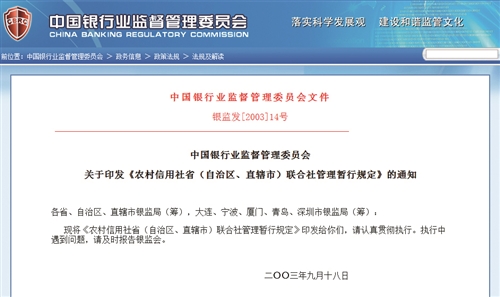 2003年9月18日,中国银行业监督管理委员会关于印发《农村信用社省(自治区、直辖市)联合社管理暂行规定》的通知(银监发〔2003〕14号)发布。
