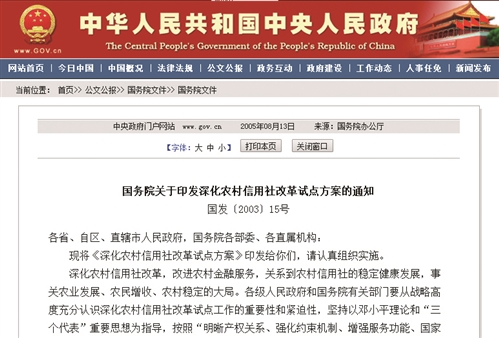 2003年6月27日,国务院印发《深化农村信用社改革试点方案》(国发〔2003〕15号)。