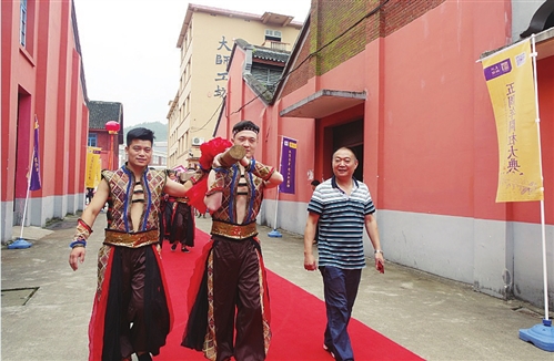 开杠大典上,新晋中国制茶大师肖益平虔诚祭杠,引领大师团队抬着千两茶大杠走向踩制场,宣布白沙溪大师工坊大师千两茶正式开杠!
