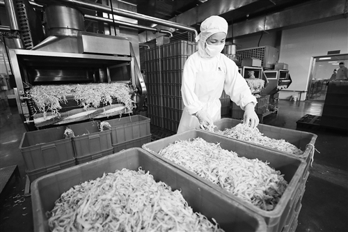 7月5日,江苏省连云港市赣榆临港产业区一家海洋食品有限公司的工人在赶制出口韩国的即食干制调味海产品。 近期正值海洋食品生产和销售旺季,江苏省连云港市赣榆区60多家海洋食品加工企业满负荷运转对海产品进行加工生产,以满足市场需求。该企业年产即食干制调味海产品3万吨、即食鲜制调味海产品1万吨,年产值100亿元,出口创汇3亿美元,带动5000余人在家门口就业。