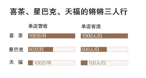 2015年,以喜茶为代表的新式茶饮完全胜出。以喜茶为例,它的单店营收可达到100万元/月,单店客流超过1000人/天,这两组数字是星巴克的二倍,更是远超天福茗茶这样的传统茶叶店(单店100万元/年,100人/天)。