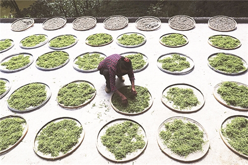 7月24日,村民在藤茶基地进行分拣工作。近年来,重庆市黔江区邻鄂镇大力发展生态农业,把一种叫“显齿蛇葡萄”的植物的藤蔓茎叶加工成藤茶产品,作为促农增收的产业。邻鄂镇通过土地流转建起了1000亩藤茶基地,每亩年产值可达8000多元,带动当地农民致富增收。