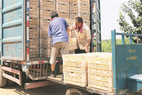 2016年1月,山东省日照市东港区供销合作社所属的坤丰农业科技公司,通过“支部+龙头企业+合作社+基地+农户”的产业模式,流转土地1500亩,投资1500余万元建设产业园。今年是第三个年头,黄桃进入亩产超6000斤的盛果期,产业发展为当地乡村振兴、农民增收发挥了作用。图为工人们正将黄桃装车准备销售。