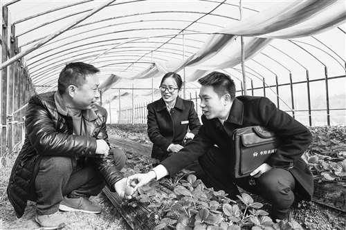 湖北枣阳农商银行为农民脱贫致富量身设计专属信贷产品“致富贷”,着力支持农民发展特色种植、养殖业。近年来,累计发放此类贷款1.37亿元,支持1600余户农户走上致富之路。图为该行客户经理贷后回访草莓种植户。