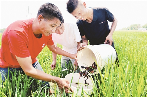 近年来,江西省鄱阳县重点发展“稻虾共作”养殖模式。在县小龙虾产业协会运作下,实行统一管理、统一种养、统一销售。目前,该县“稻虾共作”面积已达2万亩以上,年产值过亿元。通过稻虾综合种养,带动1400多户贫困家庭在龙虾产业中,利用入股分红、土地流转和劳务用工走出贫困。图为鄱阳县古县渡镇南坂村郑斌收获自己通过“稻虾共作” 生态养殖的小龙虾。