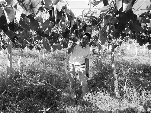 安徽省枞阳县白云生态农场农场主吴权明在生产基地里查看猕猴桃长势。2006年,他从烟花爆竹产业转行农业,种植水稻、猕猴桃、梨等产品近2000亩。2016年,吴权明与铜陵市供销合作社社属企业——供销e家铜陵地方平台合作,开展电商业务,形成线上线下融合发展模式,年产销果蔬稻麦1000多万元,带动当地20户贫困农户脱贫。
