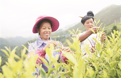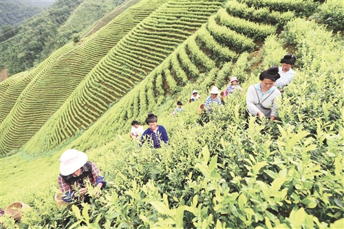 近日,贵州省丹寨县排调镇甲石村茶园内,茶农忙采茶,该村“扶贫茶园”产业基地种植茶树近2000亩,迎来夏茶采摘期。