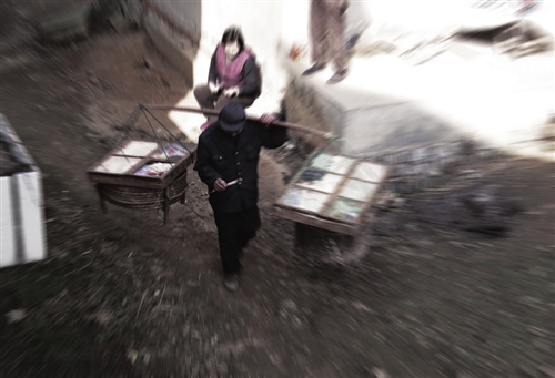 货郎担一放下,马上就被一大帮孩子围得水泄不通。看着箩筐里塞满的弹弓等小玩意儿,还有令人垂涎的麦芽糖饼,屁精的小孩们转身就往家里跑,翻箱倒柜地找出牙膏壳、废铜铁片,然后又屁颠屁颠跑回货郎担边,换购心仪的小玩具。嘴馋的孩子什么玩具都不要,就要换那诱人的麦芽糖。这时货郎人就会取出刀片对着糖饼用锤子轻轻敲打几下,“叮当”一声,薄薄的麦芽糖片就被敲下一小片来。拿着麦芽糖含在嘴里细细品尝,孩子们的心里别提有多高兴了。
