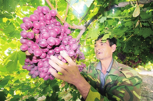 9月9日,新疆生产建设兵团第五师中心团场八十三团园艺五连的果农郑晓和正在采收刚刚成熟的“北疆”牌红提葡萄。八十三团是新疆“北疆”牌葡萄的主要种植基地,葡萄种植面积2.3万亩,年产商品果近4万吨。该团地理环境优越,光热资源丰富,昼夜温差大,葡萄色泽鲜艳、含糖量高、口感香甜。为提升“北疆”牌葡萄的品牌,该团还通过推行绿色生态的标准化葡萄管理模式,不断提升果品质量,赢得各地客商青睐。