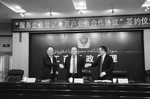 近日,新疆维吾尔自治区工商行政管理局与新疆农信、中国工商银行新疆分行举办“服务企业登记注册及开户业务合作协议”签约仪式,以共同推进工商企业网上登记、全程电子化登记和企业开户服务,标志着新疆农信全疆1420家网点将正式免费为企业、个体工商户代理工商注册登记业务。