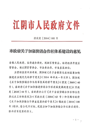 2014年12月25日,江苏省江阴市政府出台《关于加强供销合作社体系建设的意见》,把自2000年交由所在镇(街)属地管理的29个基层社,恢复由江阴市供销合作社管理,拉开了全市统筹布局供销合作社综合改革的序幕。