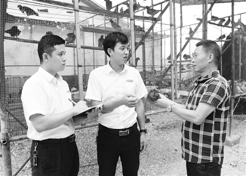 在江西南丰农商银行70万元贷款的大力支持下,南丰县白舍镇张家村村民胡长富凭借从外省学到的养殖经验,在当地办起了肉鸽养殖厂。目前,在胡长富的精心养殖和科学管理下,初期购买的1000对种鸽已发展为4000多对,预计一年后可出笼肉鸽36000羽,利润可达90万元。图为南丰农商银行客户经理来到肉鸽养殖厂了解其资金使用和肉鸽养殖情况。