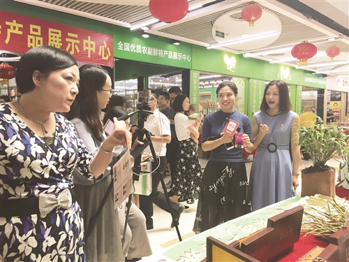 图①:奉志玉(右一)向媒体介绍赤水优质农产品。