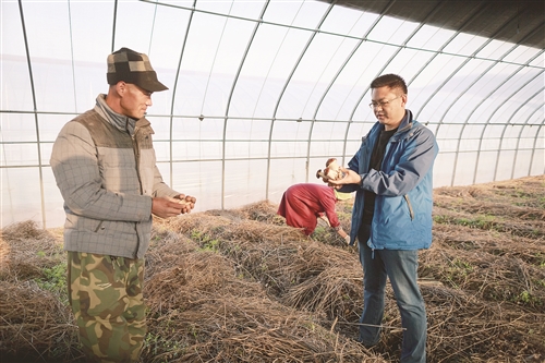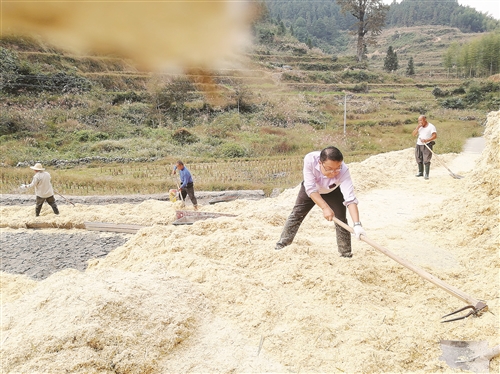 图③:湖南省社工作队与村民一同在竹荪种植示范基地上进行堆料。
