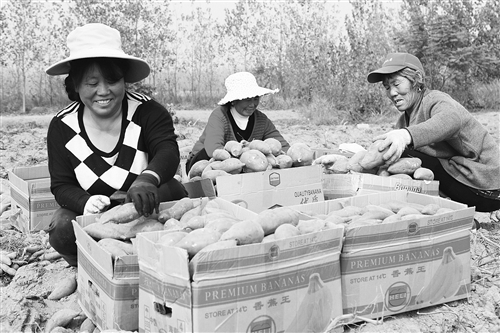 10月17日,河南省光山县椿树岗村天隆农业蔚蓝合作社社员正在地里收获客户订单红薯产品。该合作社以“基地十合作社十农户”的种植管理模式,今夏引进种植了优质品种西瓜红红薯300多亩,现在57万公斤西瓜红红薯被广东、广西等省区客户商在地里下单抢购一空。今年纯收入120多万元,可解决当地86名农民常年就业,并带动当地8户贫困户种植西瓜红红薯户均年增收1.7万元。