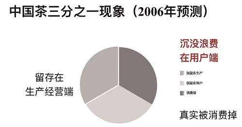 中国茶产业有一个有意思的现象:在总产量中,有三分之一的茶没有售出,留在生产端和消费端;另三分之二成功卖掉。但是在这批卖给用户端的茶中,又有一半的茶叶没有被消费掉。这背后的原因是消费者在没有喝完已经开封的茶的情况下,不断地开封新的茶,来不及喝的茶叶过了尝鲜期。这一情况被称为“沉没现象”。