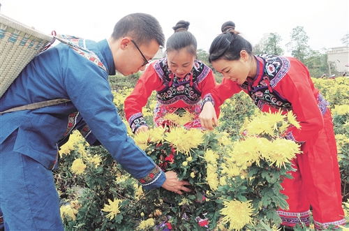 近日,贵州省福泉市龙昌镇长冲村苗族群众在菊园采摘菊花。