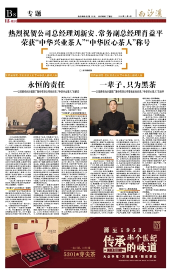 热烈祝贺公司总经理刘新安、常务副总经理肖益平荣获“中华兴业茶人”“中华匠心茶人”称号