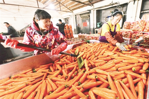 初冬时节,山东省潍坊青州市何官镇种植的2万余亩胡萝卜陆续丰收上市,吸引了许多客商前来采购。近年来,该镇通过农民合作社、家庭农场等示范带动,鼓励农民发展高产高效的胡萝卜种植,并积极推广两种两收栽培模式,产品远销韩国、马来西亚等地。目前全镇胡萝卜种植专业村已达39个、专业户6500家,年交易额4亿余元。图为何官镇乐万家胡萝卜合作社的社员正在清洗刚刚收获的胡萝卜。
