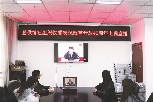光辉历程见证伟大飞跃,雄心壮志踏上崭新征程。12月18日上午,庆祝改革开放40周年大会在北京人民大会堂隆重举行。各级供销合作社认真组织系统广大干部职工收看大会实况,深入学习了习近平总书记在大会上的重要讲话以及改革先锋的先进事迹,并结合供销合作社改革发展实际,畅谈心得体会,共话落实举措。