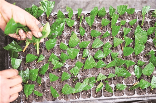 入冬以来,在湖北省宜昌市夷陵区太平溪镇许家冲村无性系茶树良种繁育基地,呈现一派初冬培育春季茶苗的繁忙景象。当地三峡移民群众忙着剪枝扦插,将一棵棵小茶苗栽植到一个个穴盘的“小方格”里,摆放在工厂化育苗大棚内进行恒温培育,以满足明年开春全国各地5000万株茶苗订单的需求。2018年1月至11月,基地已培育良种茶苗4000万株。
