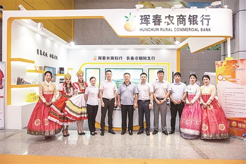 图1为在第十七届中国长春国际农业食品博览会,珲春农商银行董事长李鹰(中)、行长冯旭东(右五)与该行业务宣传团队合影。
