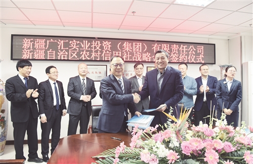 2018年12月28日,新疆维吾尔自治区农村信用社联合社与新疆广汇实业投资(集团)有限责任公司签署战略合作协议及30亿元的授信协议,用于重点支持该集团汽车销售及服务、能源和房地产开发等多领域大型综合性业务发展,此次战略合作协议的签订是新疆农村信用社贯彻落实“1+3+3+改革开放”和民营企业座谈会会议精神的具体体现,是深化银企合作的生动实践。