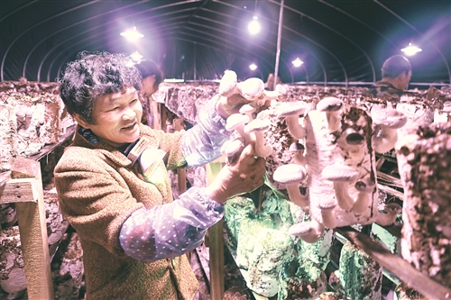 1月19日,笔者走进位于福鼎市点头镇观洋村的芳茗福鼎白茶食用菌推广示范基地。首先映入眼帘的是一排排食用菌种植大棚,棚内一排排菌棒码放整齐,在紫色LED植物补光灯照耀下,每个菌棒上面都有密密麻麻的小香菇竞相窜出,一棵棵伞状的香菇长势喜人,一派丰收景象。香菇的香味扑面而来,大棚里随处可见工人带着头灯采收香菇的身影。目前,这里的白茶香菇进入采收出售阶段。