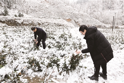 2月24日,安化县茶业办主任肖伟群带领县茶业局及乡镇领导在田庄乡天子山村、南金乡九龙池村海拨900米以上的高山茶园调研茶叶受灾情况,并指导当地政府及茶农做好灾后茶园培管和春茶生产准备工作。