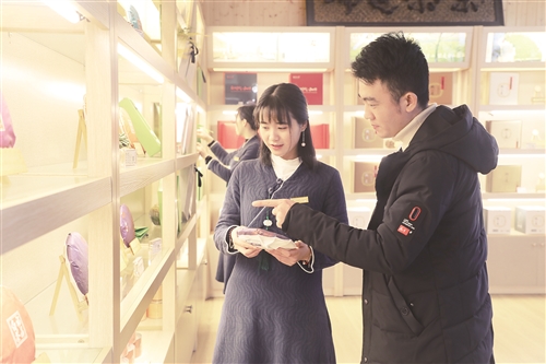 点头洋中茶叶街上,茶叶店员工在为顾客介绍产品。