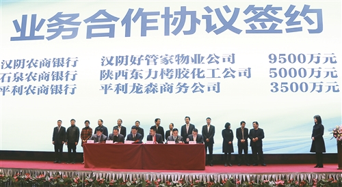 会上,安康市工信局发布了全市民营企业融资需求,安康农商银行推介了陕西信合金融产品,陕西省联社与安康市政府签订了金融支持安康实体经济民营企业发展框架合作协议;陕西省联社安康审计中心与各县区政府签订了金融服务战略合作协议,与安康市财信担保公司、安康市茶叶协会签订了金融服务和业务合作协议,6家农商银行与10家民营企业及高新区工商联总商会签订了64.6亿元的金融服务合作协议和贷款协议。安康农商银行与陕西桂花清洁能源股份有限公司分别代表农商银行和民营企业作了交流发言。