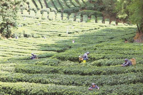 3月25日,梁平区屏锦镇笋沟村的天宝山生态茶园,茶农在采茶。阳春三月,重庆市梁平区屏锦镇天宝山的300多亩生态茶园迎来“明前茶”集中采摘期。当地四五十名茶农每天早出晚归,爬坡上坎,将采摘的嫩芽交给茶园制成红茶、绿茶。