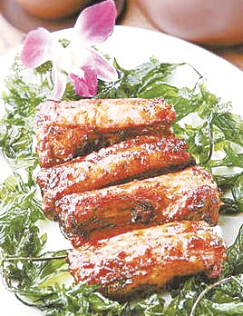 4.另起锅倒入油烧热,放一半泡过水的茶叶大火炸酥,取出,撒在排骨上。
