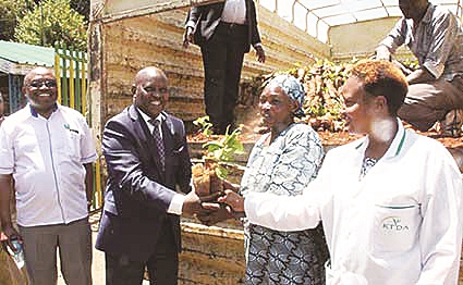 2019年4月3日,肯尼亚尼耶里省省长穆塔希·卡希加(左二)在奥赛亚伊里亚尼茶厂开始分发一种新的茶叶克隆苗。据说这种新品种的茶叶能抗旱、抗病,提高产量。